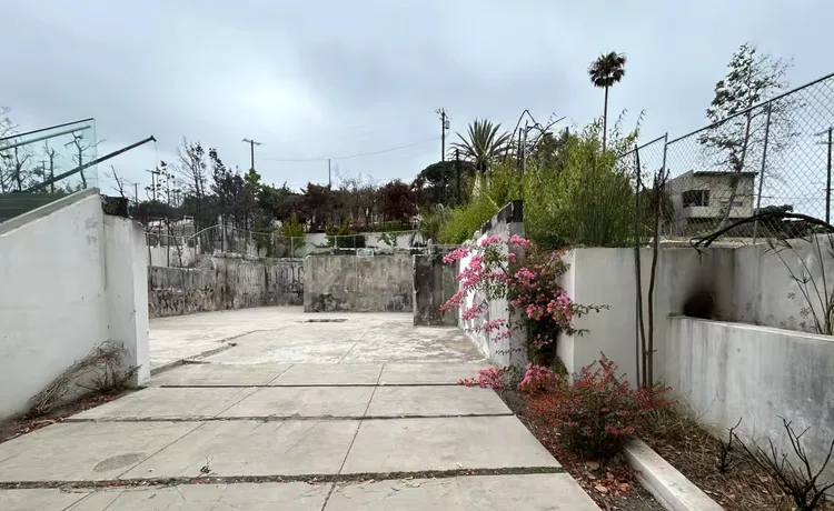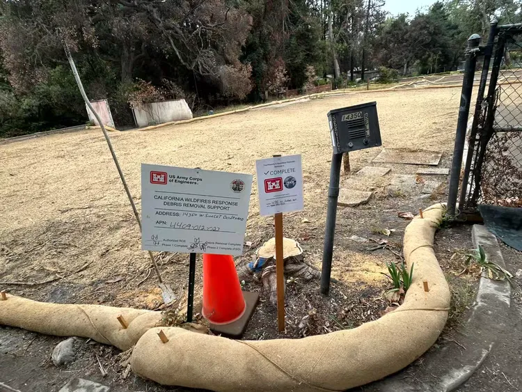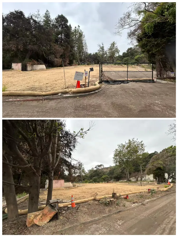 这是我头一次亲眼目睹房屋过火的焚后“遗迹”。土地很平,沉默而立,废墟上插有由美国陆军工程兵团(US Army Corps of Engineers)与洛杉矶县政府共同设置的标牌,用于标明该处房产的废墟清理工作已经完成。
