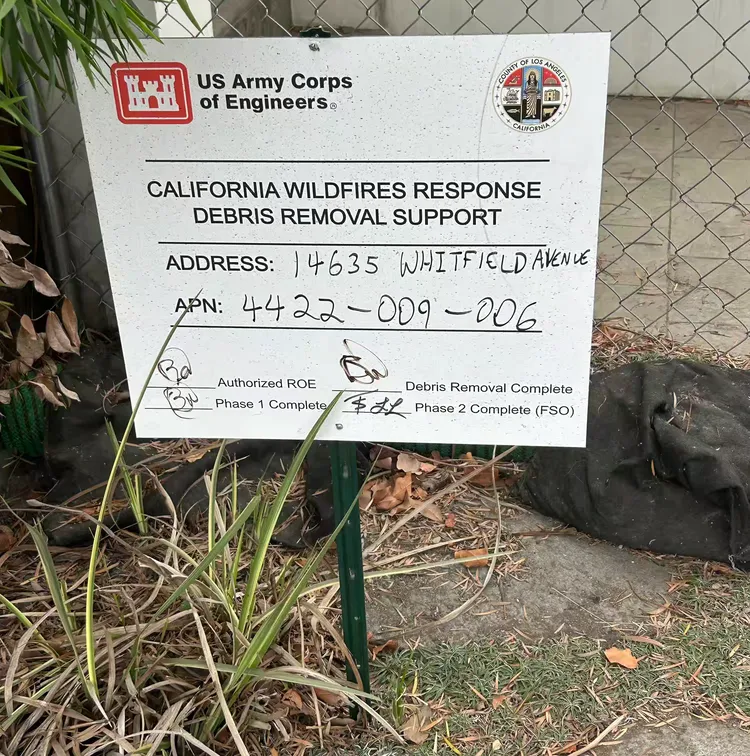 牌子上写明“项目名称”是“加州野火响应废墟清理支持(California Wildfires Response Debris Removal SuppoSu)”,进度状态是“已授权进入(Authorized ROE)”,目前处于灾后重建前的清场状态。