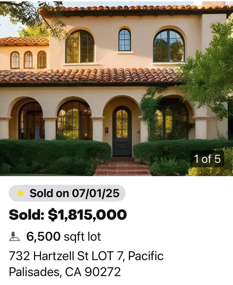 火灾后,原房屋地块已经被清理,火灾过后3个月,也就是2025年4月,该地块作为“空地”挂牌出售,开价为188万美金。3个月之后,也就是2025年7月成交,地块正式转手,价格为181万美金。