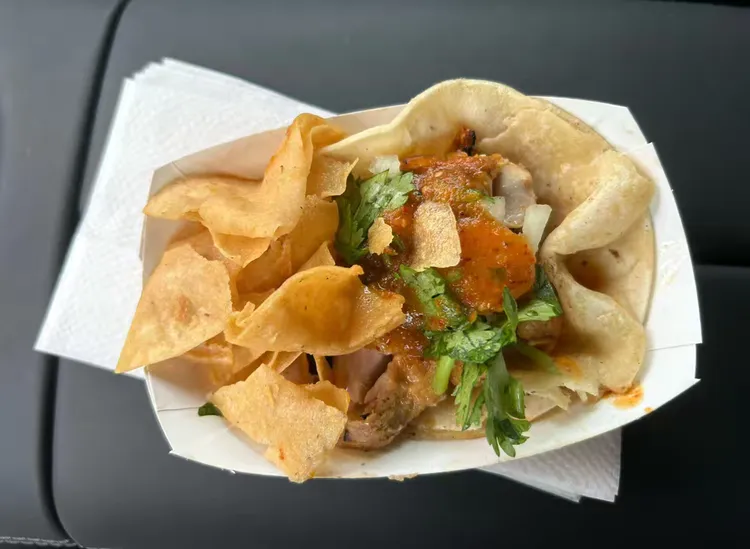 几乎每位工人买的都是两个Taco,这玩意做得吝啬不堪,用一个很小的浅边纸盒简易地装着,一手可握,我深深怀疑工人们的午餐营养是否足够支撑一整天的劳动强度。