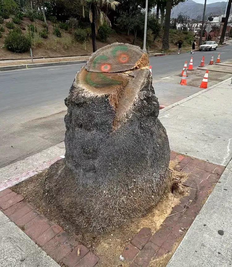(一个被画在被锯掉烧焦树干上的笑脸。)
