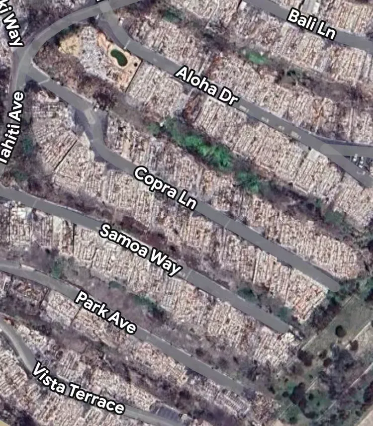 谷歌地图对灾区地貌更新的速度之快,令我诧异。现在只需打开卫星视图,就能看到火灾在城市肌肤留下的伤疤。