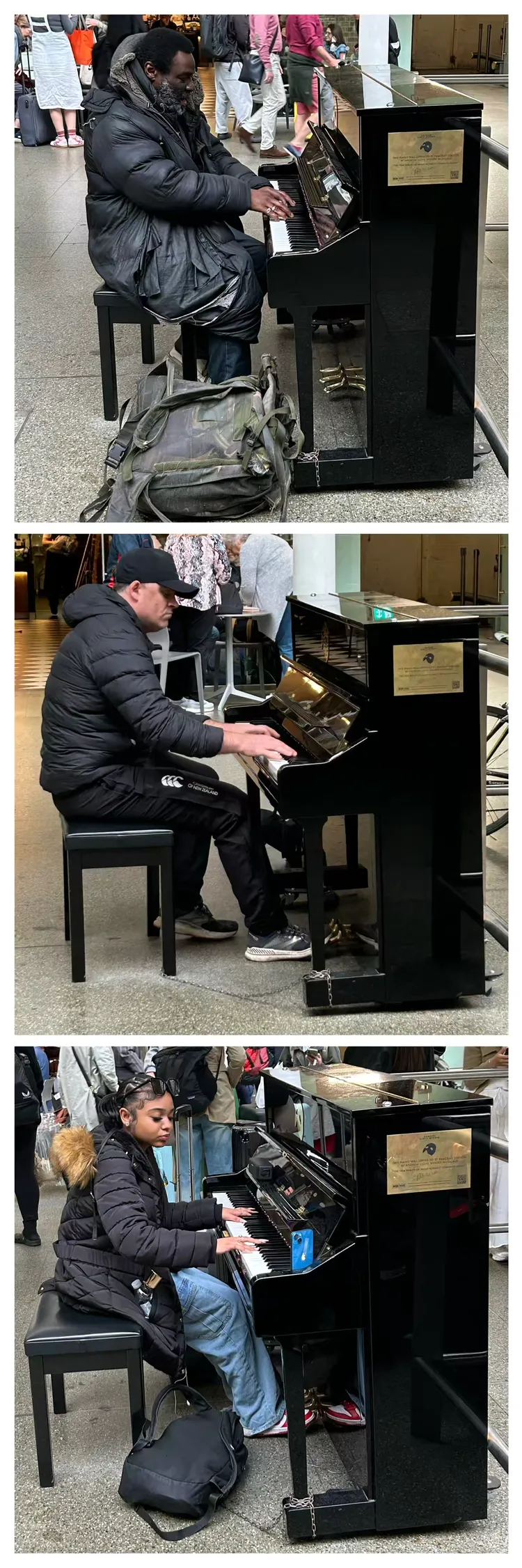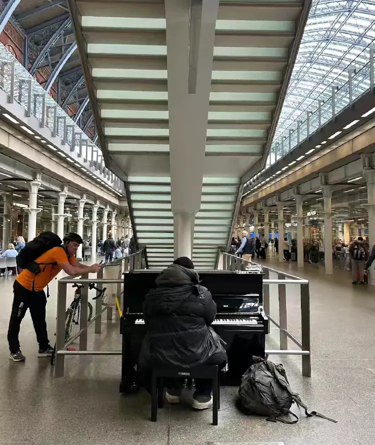 我在伦敦的前后好几天,反反复复去了圣潘克拉斯车站七、八次,每次所见情状大致类同,钢琴永远有人在弹,也永远有人远远在看。但只要前者还没离开,哪怕只是坐在钢琴前摸索,也没人前去催促打扰,这导致我甚至连想给琴拍一张独照都变得毫无指望。