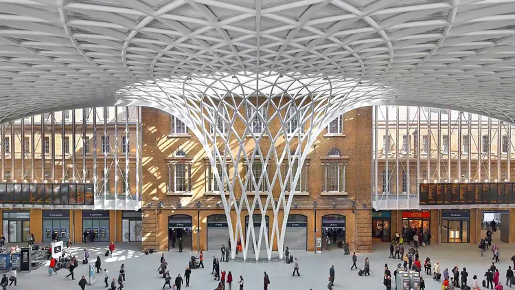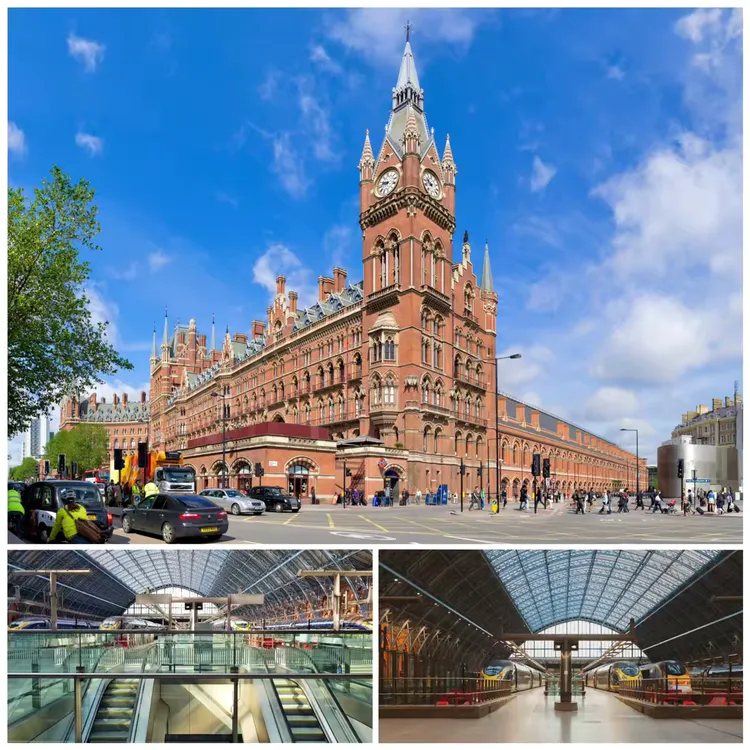 圣潘克拉斯车站的玻璃运营大厅于2000年开始大规模重建,其采用巨型钢结构和数千块三角玻璃板打造出明亮通透的半圆形空间,用作欧洲之星的国际出发厅。