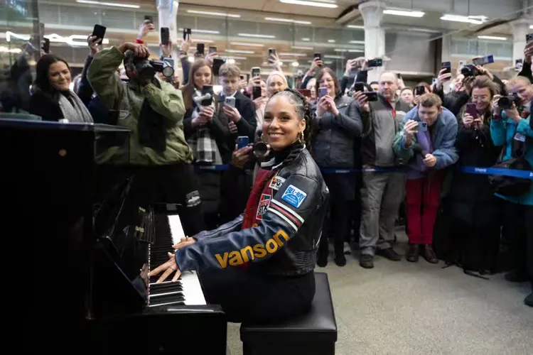 (巨星阿丽西亚·凯斯在车站弹琴。)