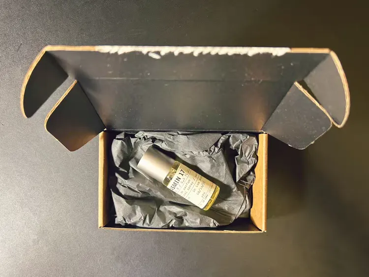 香水瓶很小,尺寸类同粗壮点的一管口红,它被放在宽大的牛皮纸盒中,被很多装饰黑纸环伺,简易得远不像瑾瑜之宝,唯其价格早已飚到平民巅峰,加税之后售价120美金(折合人民币862元)。