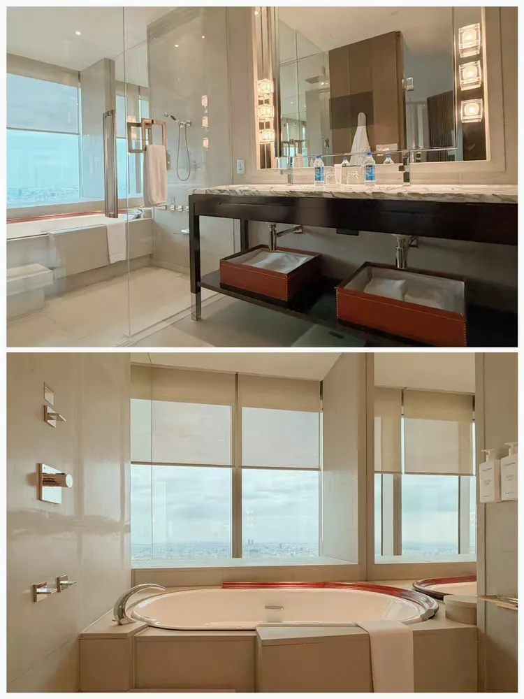 (我们柏悦房间的浴室也能看到东方明珠。)