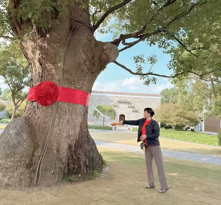 去之前就知道养云安缦有一树龄在1600年的香樟树王,高约17米、重约80吨,是从江西抚州迁来的古樟中最年长、体量也最大的一棵。迁移时,因其根须庞杂,需要几十名工人昼夜保湿、吊装、护运。