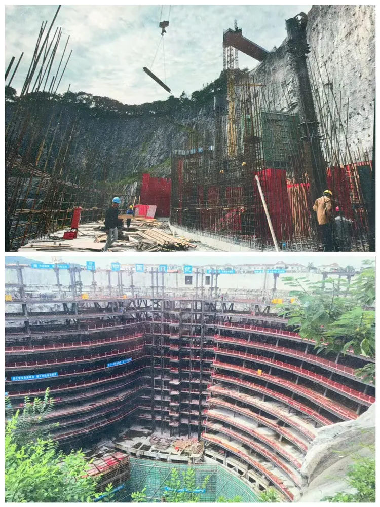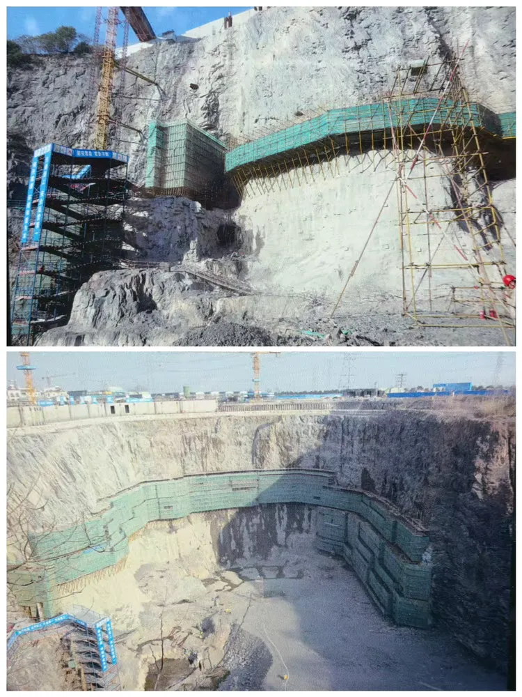 (深坑区域的岩石风化程度不同、地质条件复杂多变,必须确保整个建筑区域的崖面在极端天气和地质变化下的稳定性。在坑内主体建筑施工之前,需要对崖壁进行加固处理,研究出了“岩”“土”结合的高边坡加固技术。)