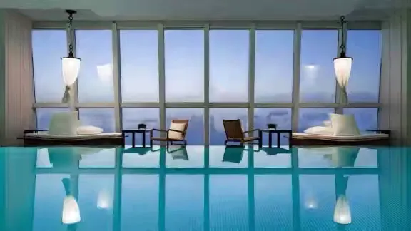 (上海柏悦著位于85层的无边泳池,自始至终都保持着“中国最高泳池”的称号。)