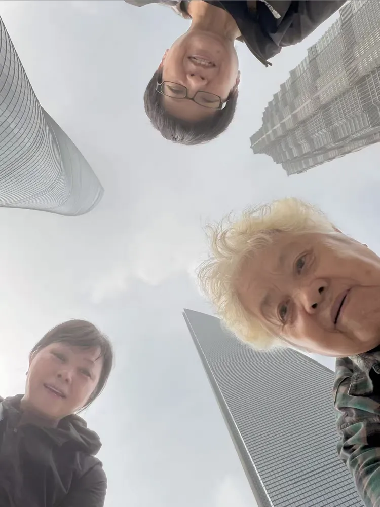 (在“三件套”交界的地面,人们把手机放于人行道上直接拍摄,就能拍到三个高楼顶部同在一框的照片。拍摄要点是,谁按快门谁脸大。)
