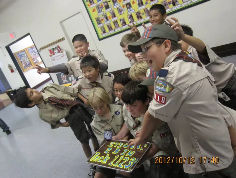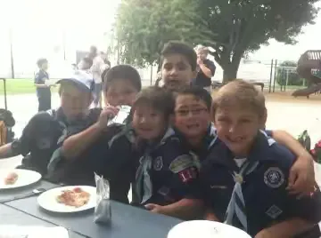 (升到小学二年级“灰狼(Wolf)”级别的儿子和他到男童军伙伴在一起活动。)