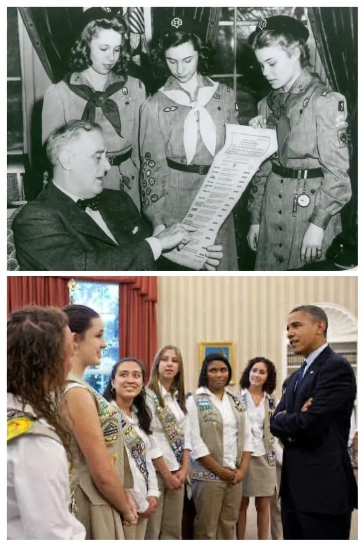 (1944年和2012年,罗斯福和奥巴马总统分别在白宫接见过女童军代表。)